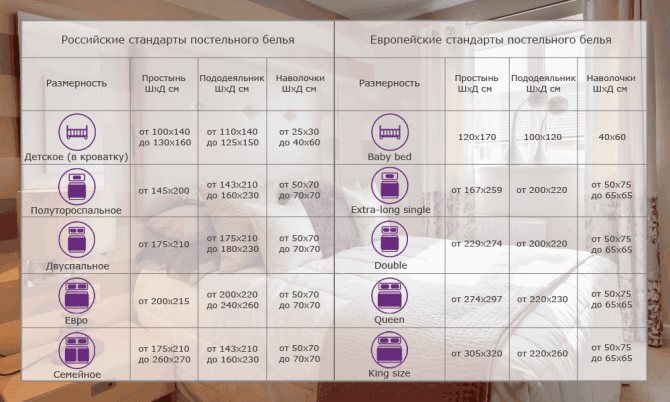 Кстати, обратите внимание, что таблица учитывают простыню с резинкой и без нее. Она необходима, чтобы закрепить ткань на матрасе.