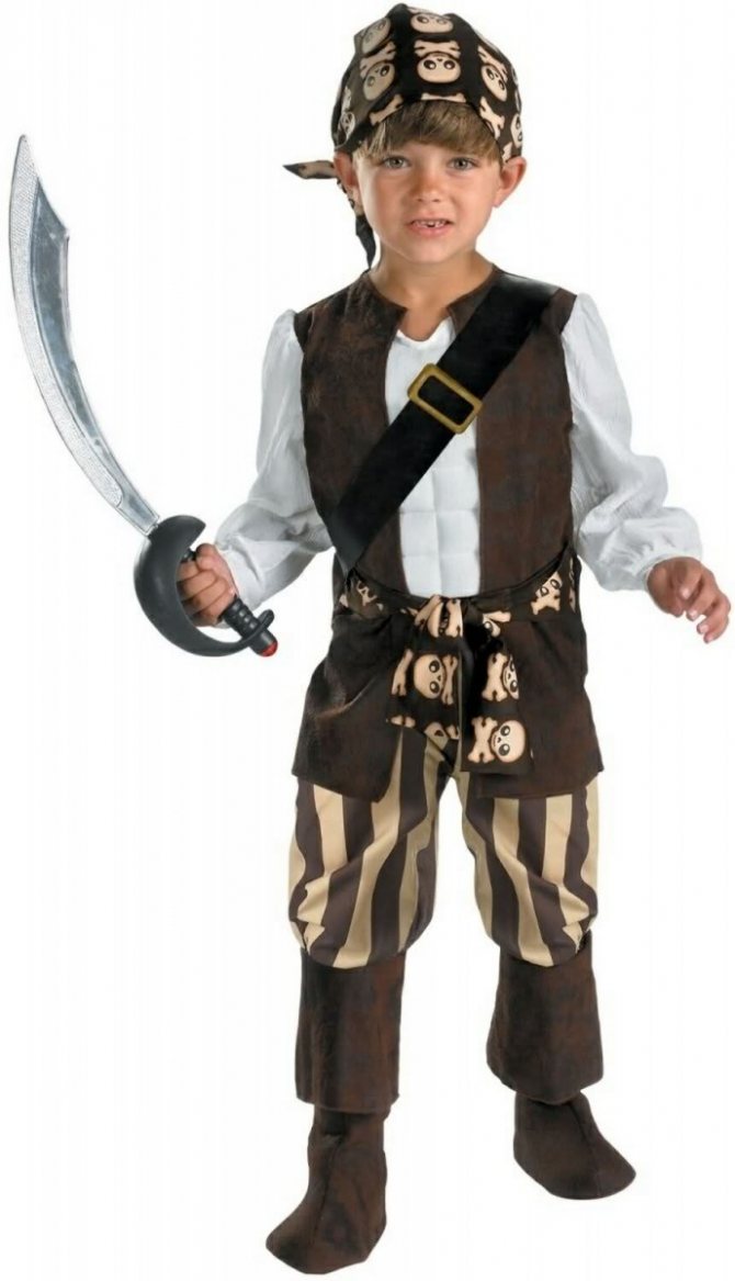 Если выбор пал на пирата по совместительству капитана корабля, тогда смело берите белую рубашку и темные, желательно черные шаровары. Подчеркнуть могущество персонажа можно с помощью красного пояса, которым мальчик подвяжет штаны.