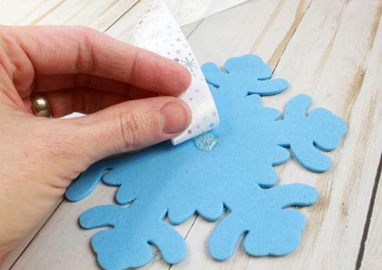 1 Клей наносится небольшим слоем на снежинку и прикладывается к ленте по центру. Прижмите. Ждите, пока клей схватится.