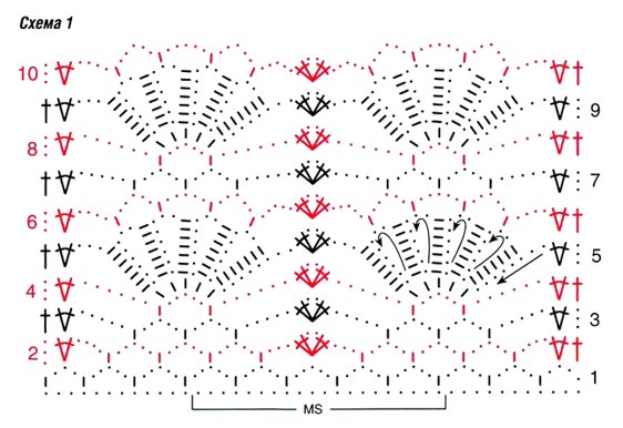 Волнообразный рисунок на 13 п.: согласно сх. 1, где приведены лицев. и изнаночн. рр. Повторяем петельки рапп. и 1-14 рр.. Вяжем чередуя 1 рапп. черной и белой ниткой.