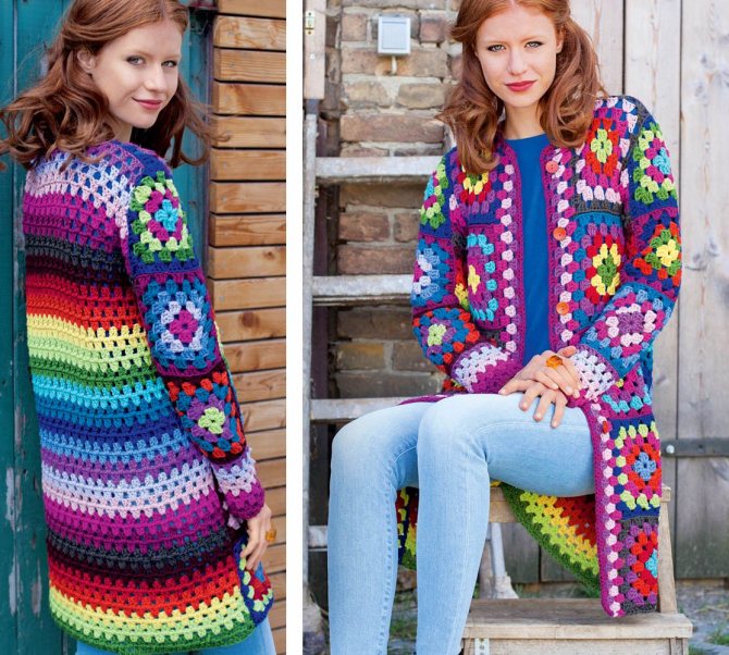 Чтобы не запутаться в последовательности соединения цветных мотивов, рекомендуется их сцепку производить во время вязания крайнего ряда. После окончания работы обвязывать края кардигана не обязательно.