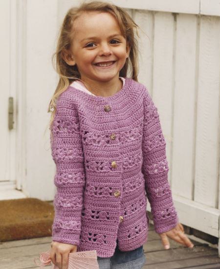 Пришиваем пуговицы вдоль края левой полочки, помещаем первую пуговицу на 1 см от выреза горловины, а остальные распределяем равномерно. Детский демисезонный кардиган крючком готов!