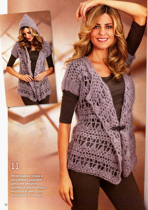- ажурные жилеты (часто из блестящей пряжи с добавлением люрекса).
