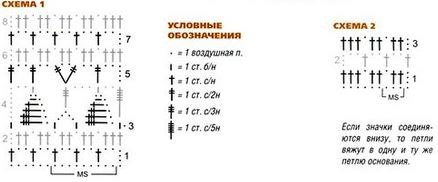 Набираем цепочку из 17 в. п. + 3 в. п. п. и вяжем 8 раппортов рисунка по сх. 1, работу оканчиваем.