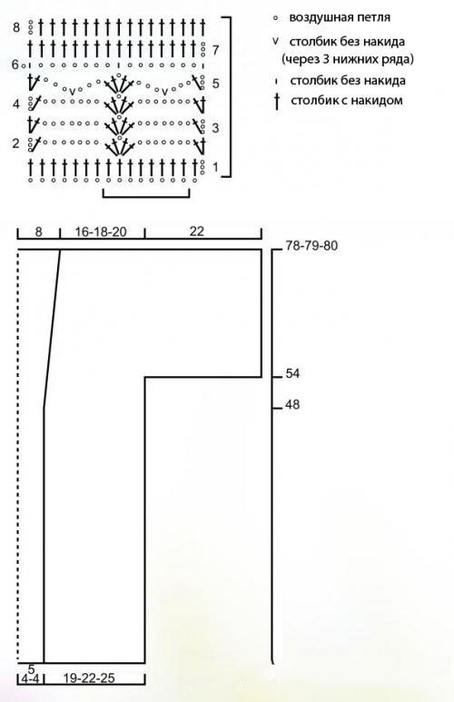 Набираем с помощью крючка цепочку из 104 (112) 128 в. п.. Вяжем далее согласно схемы до достижения высоты 54 см, после чего набираем по обе стороны по 48 в. п. для рукавов и продолжаем выполнение схемы на всех петельках.