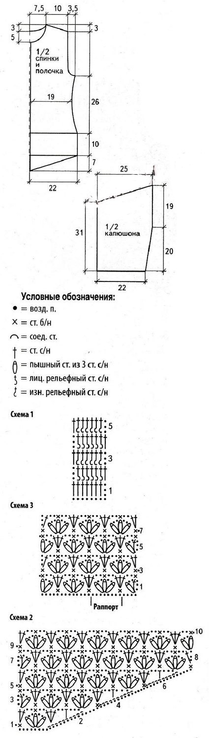 Сшиваем изделие в плечах и по бокам, по горловинке спины и передней части начинаем работу над капюшоном с рисунком по сх. 3. Связав 31 см, выполняем скос для капюшончика. Оканчиваем вязку через 39 см от набора, после чего выполняем завершающий верхний шов.