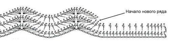 Таким образом выполняют работу до середины, а потом вяжут несколько рядов со ст. с нак. После выполнения перечисленных действий начинают вязание на убавление. При этом плетется по краю изделия три в. п. Благодаря этому работа украшается каймой.