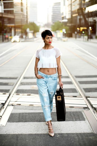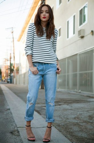 С чем носить женские джинсы бойфренды летом? Например, с воздушными блузами и футболками. Цветовая гамма остается полностью на ваше усмотрение. Приветствуются однотонные варианты и модели с узорами в клетку, надписями и рисунками.