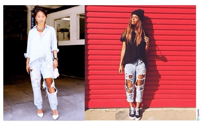 Рваные джинсы бойфренды надевают поклонники расслабленных городских аутфитов. Сочетать их можно со свитерами оверсайз, ассиметричными свободными блузами, летними футболками. Деним отлично смотрится с однотонными кофтами светлых, темных и синих оттенков. Особый шик — заправить блузу спереди.