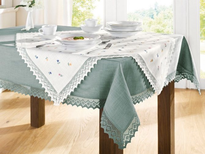 - Помещение. Чтобы изделие смотрелось в интерьере гармонично, то в первую очередь следует решить, в какой комнате оно будет располагаться. Если это будет стол в гостиной, то можно взять слегка вычурную ткань, с небольшой пышностью — она скажет о хорошем вкусе хозяев дома. Если это парадная комната, то лучше не экономить, а взять дорогую качественную скатерть. Например, хорошо будет смотреться матовый атлас с кружевом по краю, вышивкой гладью или мережкой. Самое главное, чтобы цвет гармонировал со всем интерьером. Для кухни скатерть должна быть максимально практичной, не бояться стирок, не впитывать в себя воду и ни в коем случае не скользить.