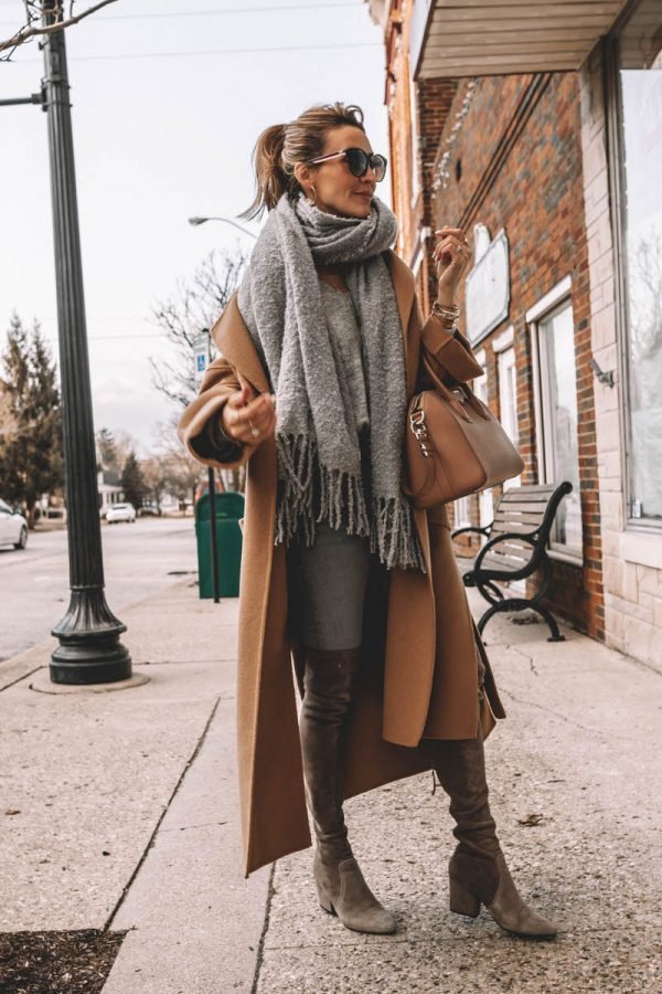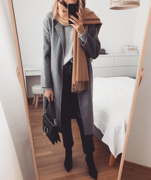 - Подобрать шарф к серому пальто совсем просто, ведь такой нейтральный по характеру колер чудесно гармонирует и с базовыми, и с яркими тонами. Так, элегантным решением будет сочетание серого и бежевого цвета в одном образе. Если вы хотите усилить эффектность и выразительность аутфита, можете подобрать сочную расцветку аксессуара – она создаст отличный акцент на нейтральном фоне.