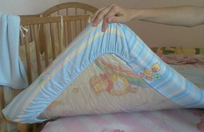 Ну вот и все, у нас готова детская простынь на резинке. Своими руками изготовить ее совсем несложно. Теперь ее нужно проутюжить. Легче всего это сделать, надев ее на матрасик. Это наиболее быстрый и удобный способ.