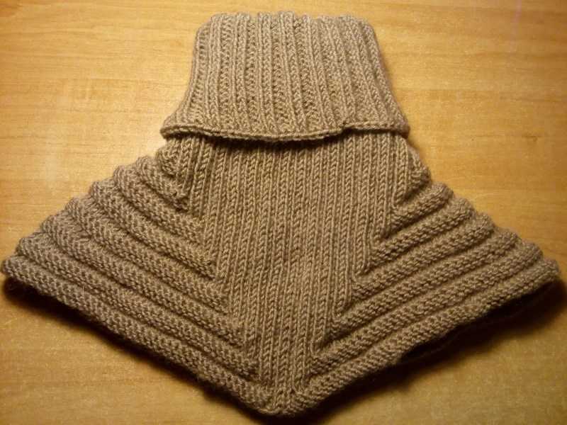 Оплечье у нас уже есть и пора приступать к горловине. Для этого понадобятся спицы с коротким участком лески. Вяжем все также без изменений по рисунку 6 рядов, пока не останется 38 петель. Теперь приступаем к вязанию горловины. Ее длина выбирается индивидуально. В пределах 12 – 20 см. заканчиваем вязание 3 рядами платочной вязки. Закрываем полотно.