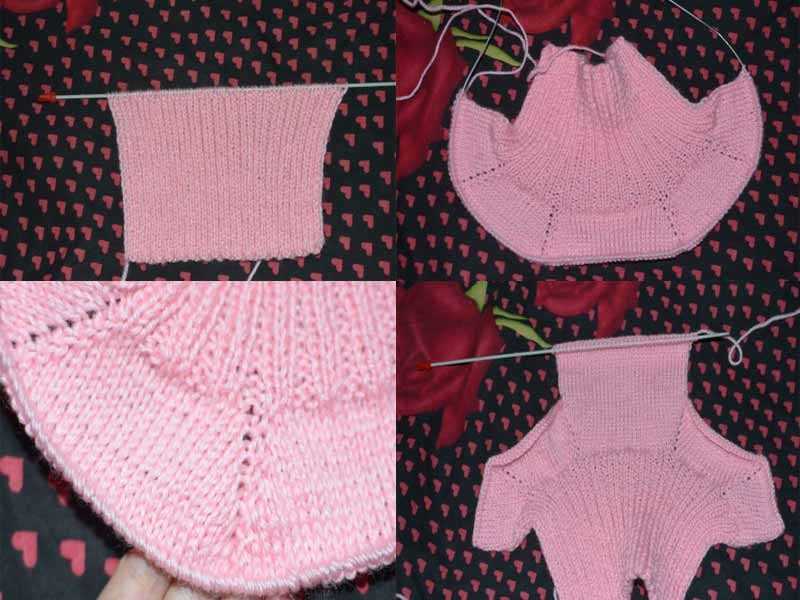 На спицах осуществляется набор рассчитанного количество петель любым известным способом. Чаще всего горловина вяжется резинкой 2х2 или 3х3, поэтому сумма петель должно быть кратна 4 или 6. Петли равномерно распределяются на 4 спицы и вяжется узор до достижения нужной длины ворота. С этого момента начинаются прибавки на манишку.
