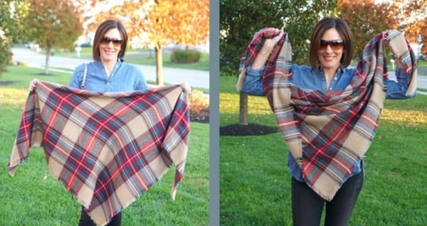 - Взять края шарфа за уголки и завязать их двойным узлом.