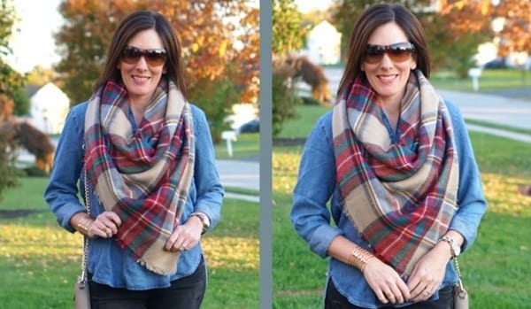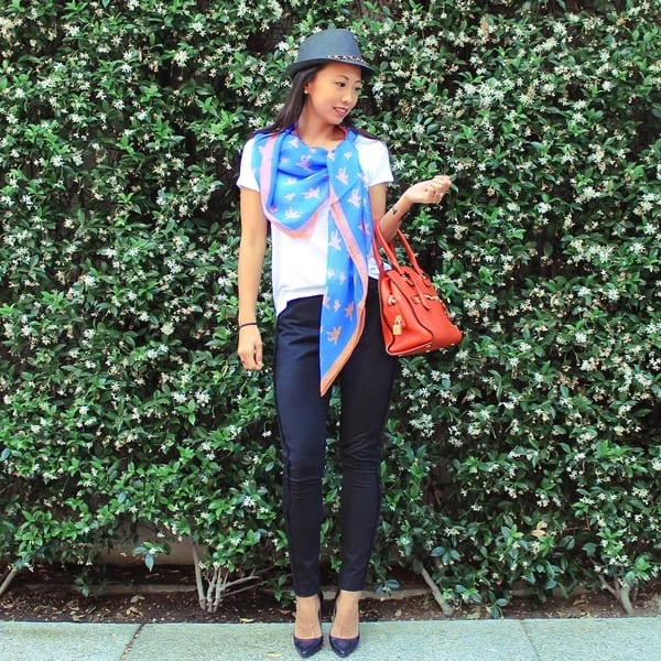 Существует еще один популярный способ превращения привычного платка в стильное украшение образа модницы.