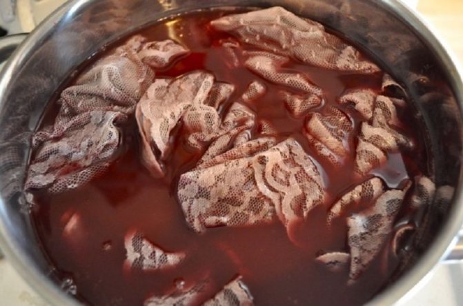 После этого вещество стоит процедить и перелить в тару с водой температурой примерно +30 градусов. Раствор рекомендуется перемешать и поместить в него тюль. Штору следует регулярно переворачивать. После получения требуемого оттенка изделие нужно ополоснуть чистой водой.