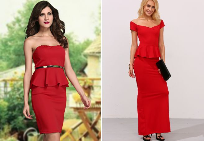 Красное платье с баской, как на фото с показов, подходит активным, уверенным в себе личностям. Агрессивность цвета притягивает взгляды. Нужно уметь строить гармоничные комбинации с ним. Женщина, выбравшая это одеяние, воплотит образ роковой красавицы, разбивающей сердца мужчин.