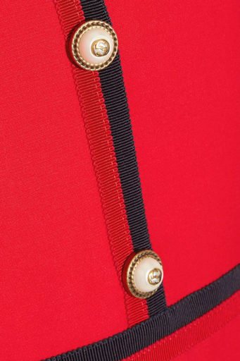 Интересной особенностью жакета является наличие контрастной отделки в виде бейки, которой украшают изделие по контуру. Той же бейкой отделывается вход в карманы. Для отделки красного костюма, чаще всего используется черная или белая бейка.