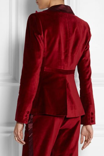 Красный вечерний костюм может иметь максимально лаконичный покрой. Чтобы такая модель выглядела нарядно, её шьют из красивой ткани, бархатной или велюровой. Это ткань с ворсом, которая красиво переливается на свету. Поэтому модели из этих тканей делают максимально простыми, сложный крой не позволит оценить красоту ткани.