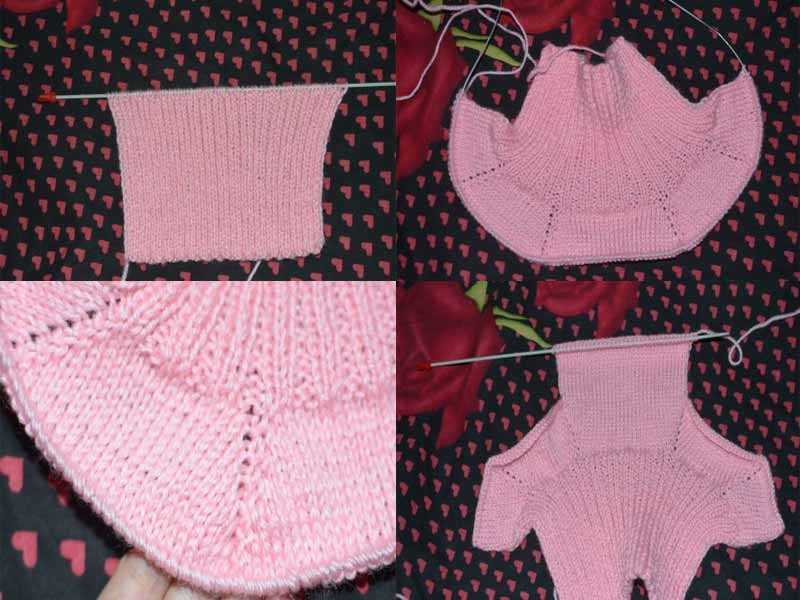 Далее, необходимо перейти на вязание основной части изделия. Вязание осуществляем лицевой гладью. Начиная с первого ряда, нужно сделать прибавки перед каждой 4 петлей ряда и через 3 ряда (1, 5, 9…ряды). Петли добавляются из протяжки или путем скрещивания основной нити.
