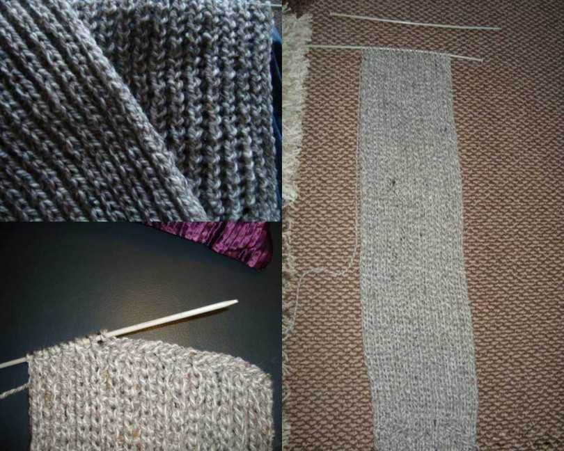 Набрать на спицы нужное количество петель, плюс 5 петель для части планки, которая будет заходить внахлест на изделие. Первый ряд: 5 петель лицевых, чередование – 2 изнаночные, 2 лицевые (резинка 2х2), последние 5 петель провязать лицевыми. Далее, первые и последние 5 петель каждого ряда всегда провязывать лицевыми петлями.