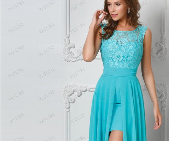 - Юным особам придется по вкусу стильное бирюзовое платье с юбкой-полусолнцем длиной до середины бедра. Соблазнительные прозрачные вставки показывают стройные ноги. Такой образ превосходно подходит для посещения ночного клуба или романтического свидания. Нежные аксессуары в тон и босоножки на платформе дополнят нежный образ.