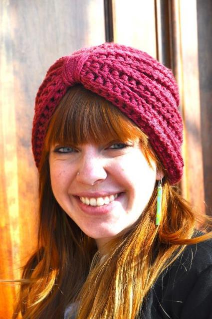 Вязаная шапка-чалма, изготовленная из разноцветной пряжи, сочетается с одеждой на каждый день. Хорошо смотрится на шатенках с теплым тоном кожи.