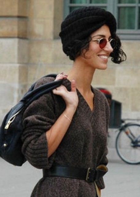 Вязаная шапка-чалма черного цвета хорошо смотрится с удлиненным свитером темно-коричневого оттенка. Великолепно вписывается в повседневный образ.