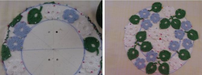 - Разместить ее на твердой поверхности, а сверху закрепить булавками связанные заранее кружевные элементы, выполненные нитками разных цветов.