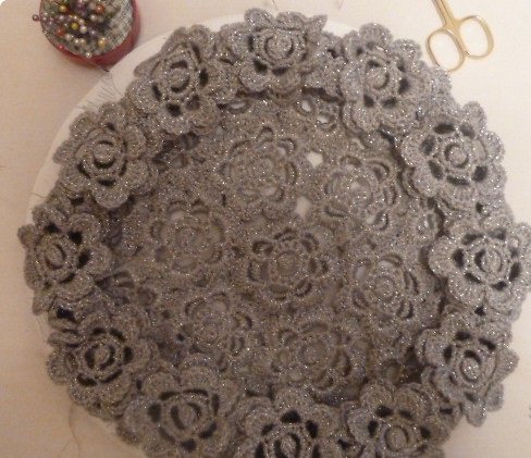 - Связанные объемные или плоские цветы, которые накрахмаливаются и закрепляются снизу вверх.