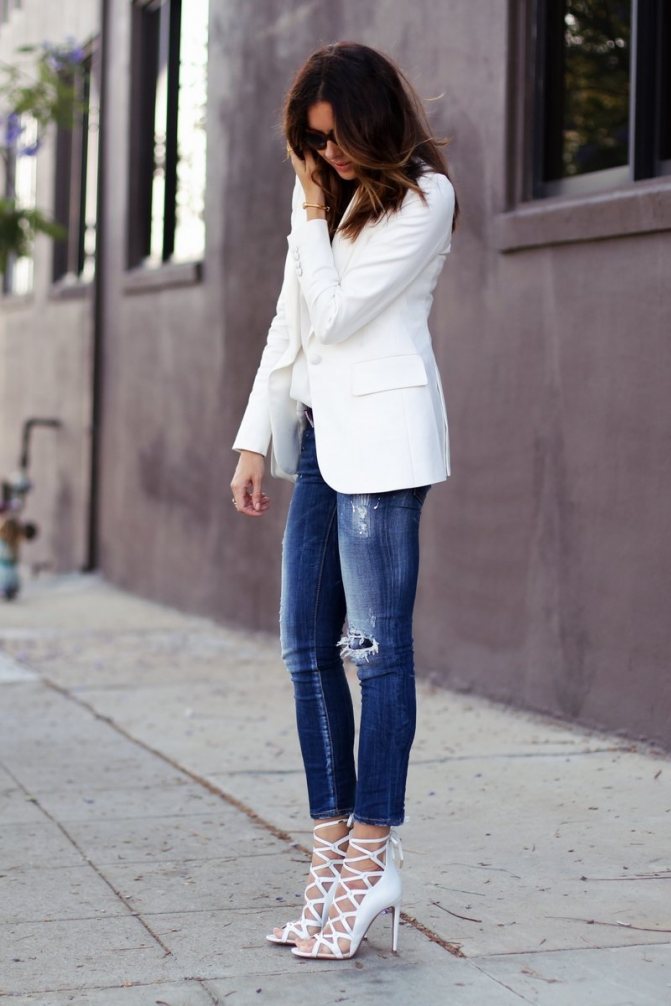 - С белым пиджаком сочетаются все фасоны джинсов. Такой образ сделает даму элегантной и стильной. Пиджак с джинсами черного или голубого цвета поможет создать строгий образ, а яркий низ сделает лук расслабленным, внесет в облик непринужденности.