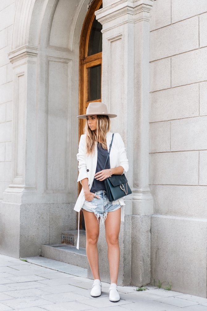 - Смелое сочетание пиджака с шортами могут позволить уверенные в себе дамы. Гламурный образ помогут создать классические шорты и блуза. Белый жакет с низом из джинсовой ткани будет достойной основой морского стиля. Можно подобрать шорты темного цвета, дополнив образ ботильонами или босоножками на каблуке.
