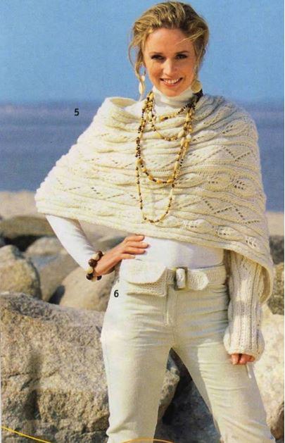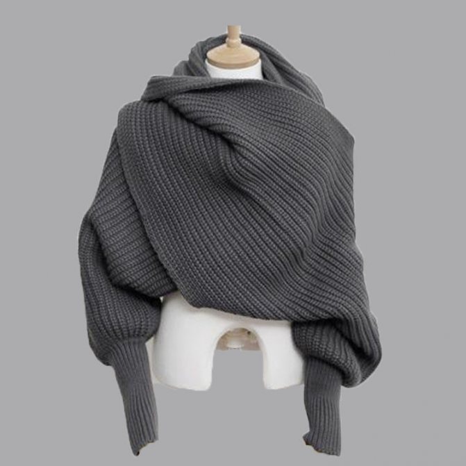 Шарф, который с легкостью превращается свитер или болеро, очень удобная вещь. Его так же можно использовать, как капюшон или палантин. Рукава вяжут разной длины. Вяжется шарф — свитер очень просто. Тем кто хочет научиться вязать, этот вариант подойдет. Чтобы понять, как одевается такой аксессуар, обратите внимание на рисунок ниже.