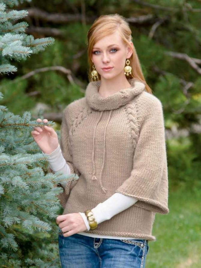 Узор «английская» резинка. Берем шерсти — 500 грамм. Спицы третьего номера, размер — 40 на 200. Набираем петли (нечетное число), например, 99. Вяжем подходящую длину. Для манжет, набираем петли по краям, вяжем спицами круговыми, резинку 1 на 1 (20 или 30 сантиметров). Соединяем края рукавов — сшиваем 20 сантиметров, главного полотна, в общем, их длина должна составить — 50 сантиметров.