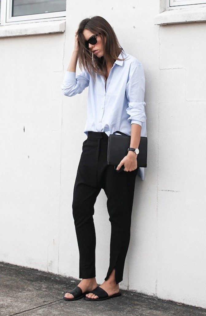 К основным вещам, составляющим его основу, относятся юбка-карандаш, тренч, бежевые лодочки и, конечно же, женские черные брюки. Они без проблем сочетаются как с простыми, так и дизайнерскими вещами и позволяют создавать неординарные образы в любом стиле.