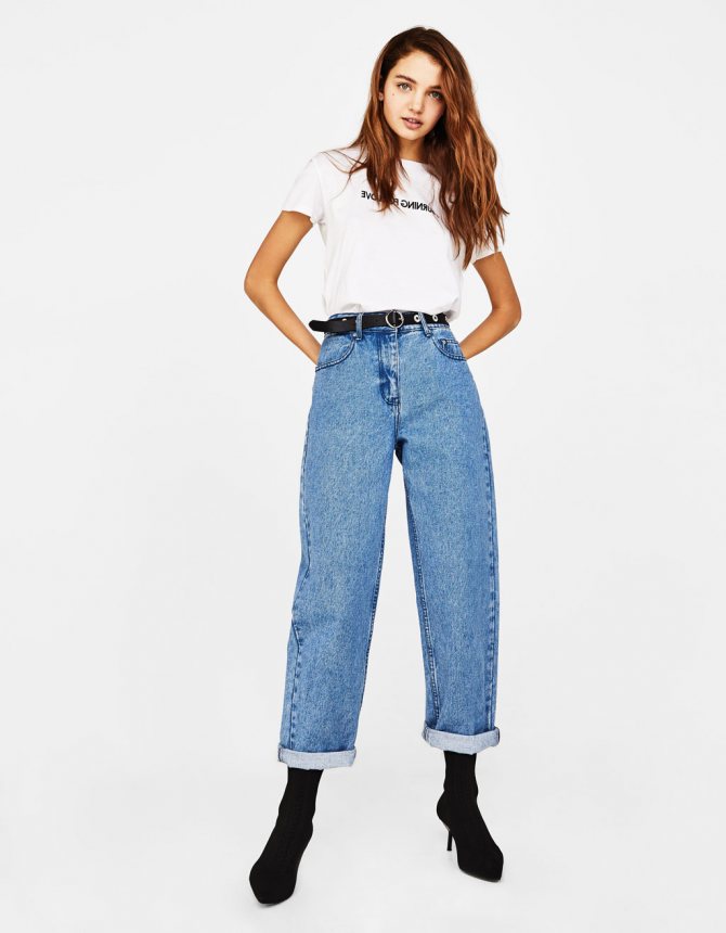 Эти модели джинсов, широкие и мешковатые по всей длине, сочетают с объемными свитерами или футболками, которые заправляют под пояс. Также с широкими джинсами отлично смотрятся укороченные топы, обтягивающие водолазки, гольфы и рубашки свободного кроя.