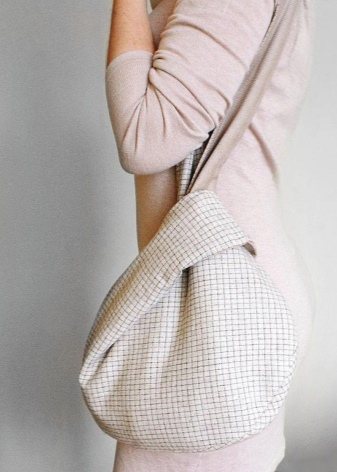 Она так названа потому, что этот узелок является способом закрытия и ношения сумки. Ее выкройка проста: одна часть – боковая сторона (основная часть сумочки, в которой будут лежать вещи, и две ручки, одна короче другой) и круглое дно-основание. Можно сшить модель и без основания – зависит от индивидуальных предпочтений.