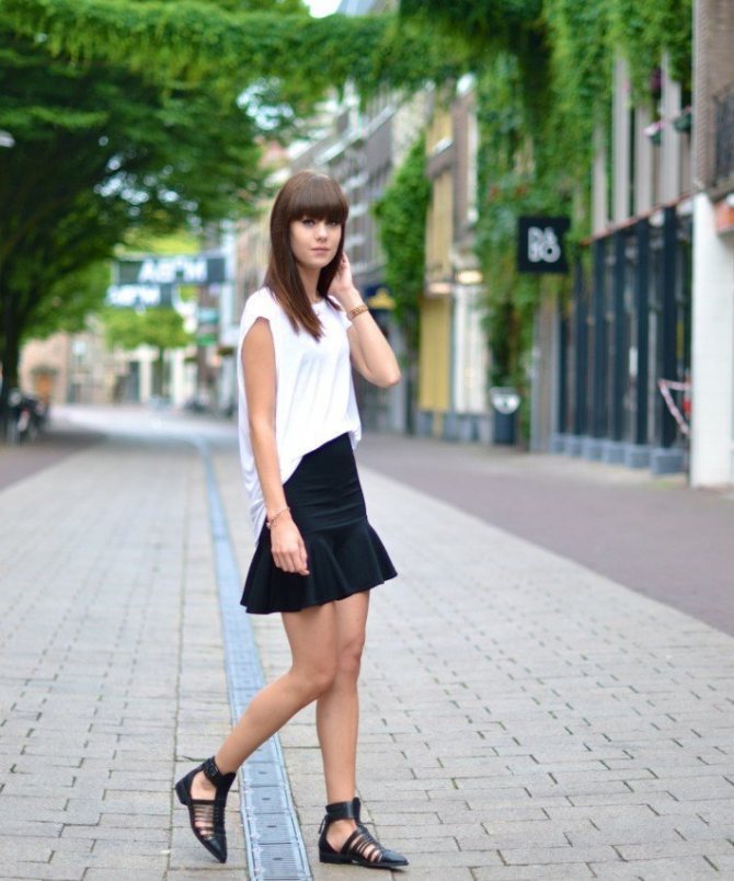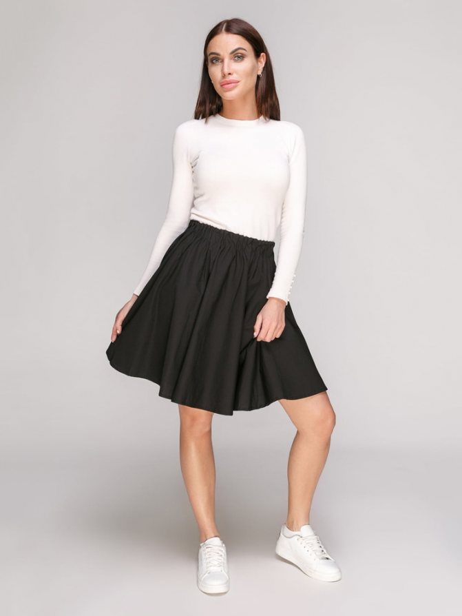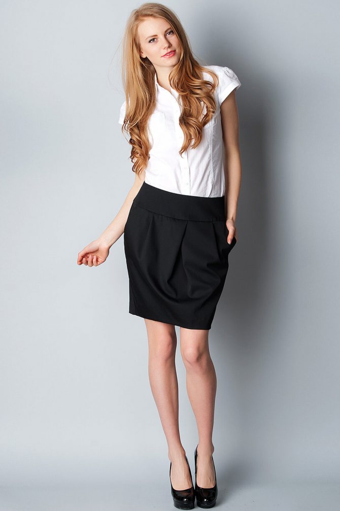 Мини считается юбка, подол которой заканчивается на 15 сантиметров выше колен. Она открывает большую часть ног, поэтому подходит стройным девушкам невысокого или среднего роста. Черную короткую юбку можно сочетать с джемпером свободного кроя, футболками. Из обуви подойдут туфли на среднем каблуке или плоской подошве. При создании вечернего образа с короткой юбкой носят туфли на шпильке. При этом верх должен быть закрытым, чтобы наряд не выглядел вульгарно.
