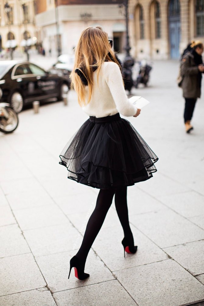 Что касается цветовых сочетаний, то с черной юбкой-баллоном хорошо смотрится ткань любых оттенков. Дополните лук капроновыми колготками в тон кожи.
