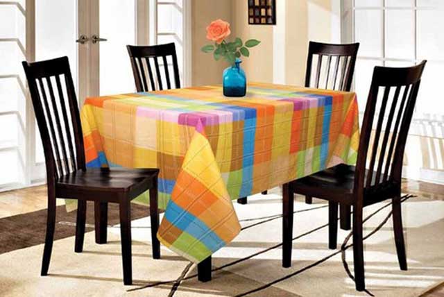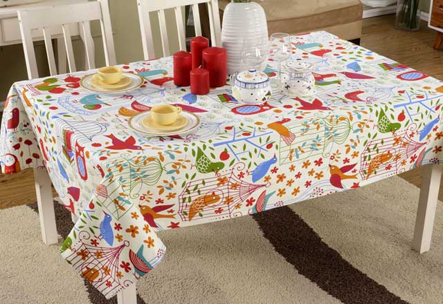 Выше было отмечено, что скатерть с тефлоновым покрытием может быть изготовлена из разных тканей, поэтому она подходит как для сервировки праздничного стола в самых торжественных случаях, так и для ежедневного использования на кухонном столе. Все зависит только от выбора материала и его расцветки. Натуральные ткани пастельных цветов, со сложным узорчатым переплетением нитей, поспособствуют созданию изысканной атмосферы в гостиной. Хлопковые ткани с «веселым» принтом подойдут для кухни, а также для сервировки стола для обеда на пикнике.
