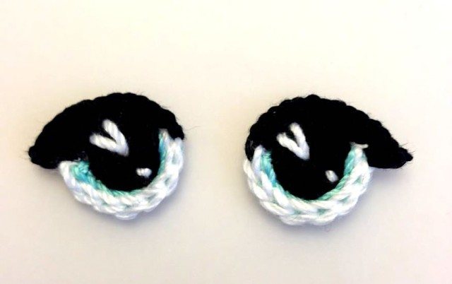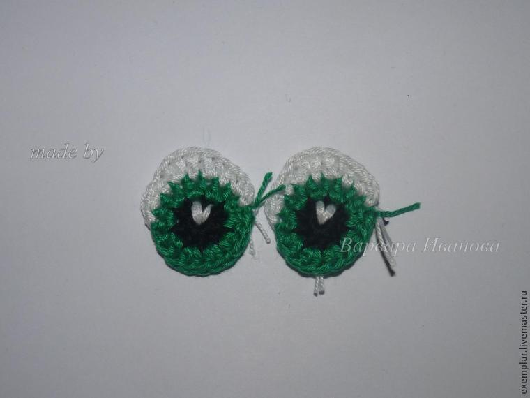 Вязаные глаза для куклы. Не знаю как вам, а мне нравятся вязаные глаза, которые связаны крючком. Это удобно для тех, кому трудно вышить глаза на кукольном лице. Преимущества это метода: Можно связать глаза разной формы. Глаза будут всегда идеальны, ровны и гладкие Эти глаза никогда не перекосите и не испортите кукольное лицо Готовые вязаные глаза крючком приклеиваются на кукольное лицо. При необходимости их можно прошить тоненькой ниткой в цвет по краю глаза. Существует очень много вариантов вязания глаз крючком. Каждый мастер вяжет глаза по своему, вот один из вариантов. Вязаные глаза для куклы 1. Нитью черного цвета сделать кольцо амигуруми и связать в нем 7 столбиков без накида. 2. 2 СБН в каждую петлю по кругу, соединительный столбик в первую петлю круга, оборвать нить = 14 СБН. 3. Нитью голубого цвета только за заднюю петлю, соединительный столбик в последнюю петлю раунда 2, СБН в следующие 7 петель , соед. столбик в след. петлю, оборвать нить. 4. Белой нитью только за заднюю петлю, соединительный столбик в ту же петлю раунда 2, в которой вы начинали в раунде 3, затем продолжайте вязать над петлями голубого цвета в 3-м раунде, соединительный столбик в следующие 7 петель, соед. ст. в ту же петлю раунда 2, что вы сделали для последней петли в раунде 3, а затем оборвать нить. 5.Первый глаз: черной нитью, только за заднюю петлю, соед. ст. в последнюю белую петлю раунда 4, затем продолжайте над раундом из черных ниток раунда 2, 2 СБН в след. 5 петель, 2 ПСН в след. петлю, затем 2 ПСН в первую белую петлю раунда 4, оборвать нить. Второй глаз: черной нитью, только за заднюю петлю, в ту же петлю что, 3-й раунд и 4, закончить во 2-м раунде (соед. ст., 4 в.п., СС2НTR, ССН). Затем 2 ССН в следующую петлю, (ПСН, СБН) в следующей петле, 2 СБН в следующих 2 петлях, соед. ст. в следующей петле, соед. ст. в первой белой петле раунда 4, оборвать нить. Белой нитью сделать стежки на центральной черной части глаза. Обрезать и приклеить концы нити к задней части глаза.