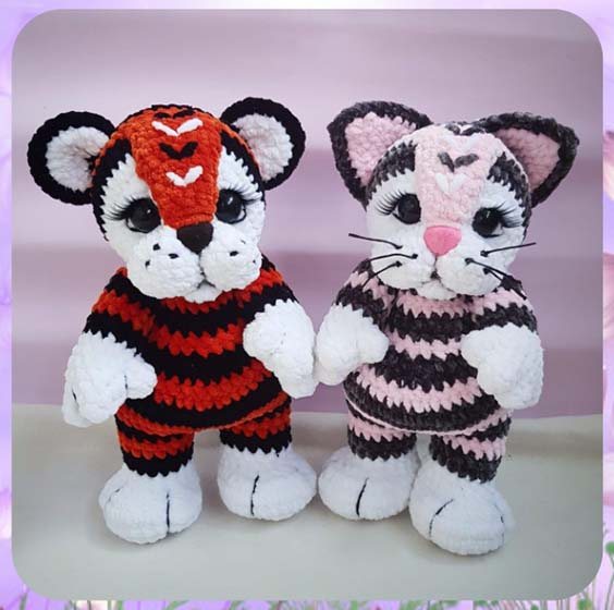 По одной схеме можно связать милую парочку – тигренка Эрни и котика, они отличаются только цветом ниток и чуть оформлением мордочки.