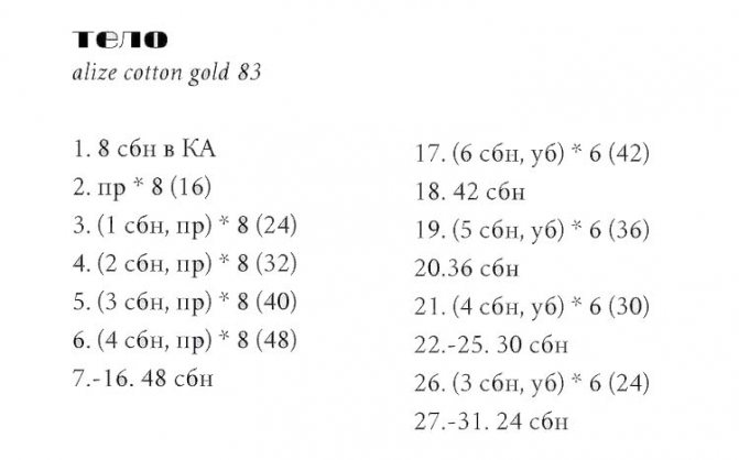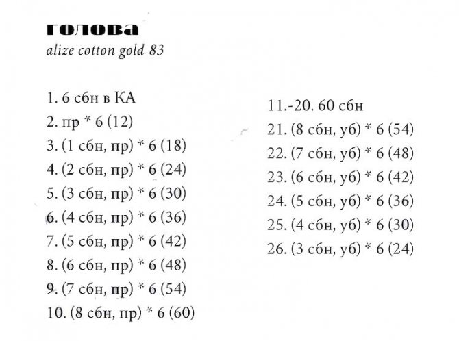 Для вязания игрушек амигуруми подойдет любая пряжа средней толщины, в данном случае использованы нитки Alize Cotton Gold и немного YarnArt Jeans для мордочки. Крючок подбираем под их толщину.