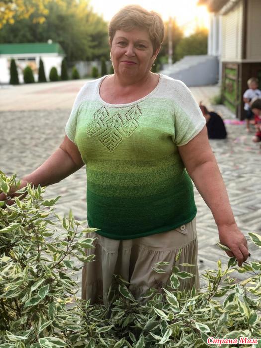 Модель связана спицами №2, нитки “Нарцисс” (100% хлопок). Полочка, спинка вяжутся отдельно ажурным узором, рукавчики платочной вязкой. Описание топа Платочная вязка: лиц. и изн. р. – лиц. п. Ажурный узор: число петель кратно 12 + 6 + 2