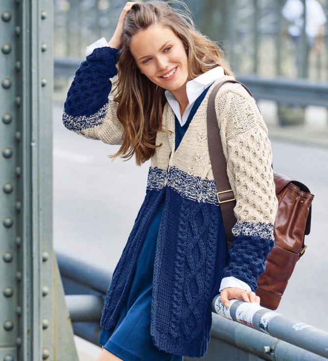 Для вязания теплых моделей кофточек больше подойдут рельефные узоры – косы, различные переплетения, ромбы и т.п., в сочетании с мелкими однообразными видами узорами спицами.