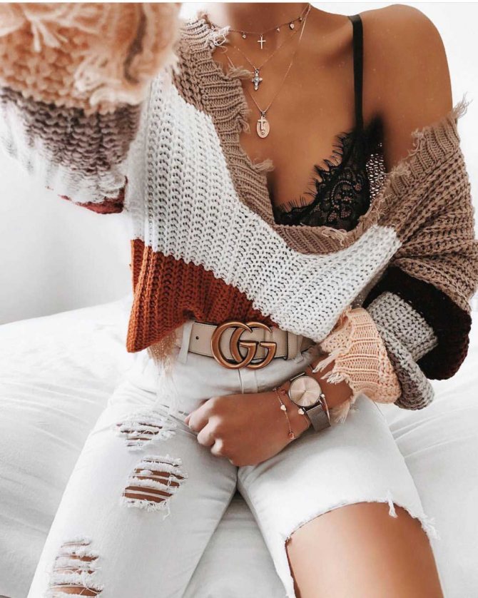 При правильном сочетании вещей такие свитера могут как подчеркнуть талию и аккуратность девушки, либо скрыть лишний вес.